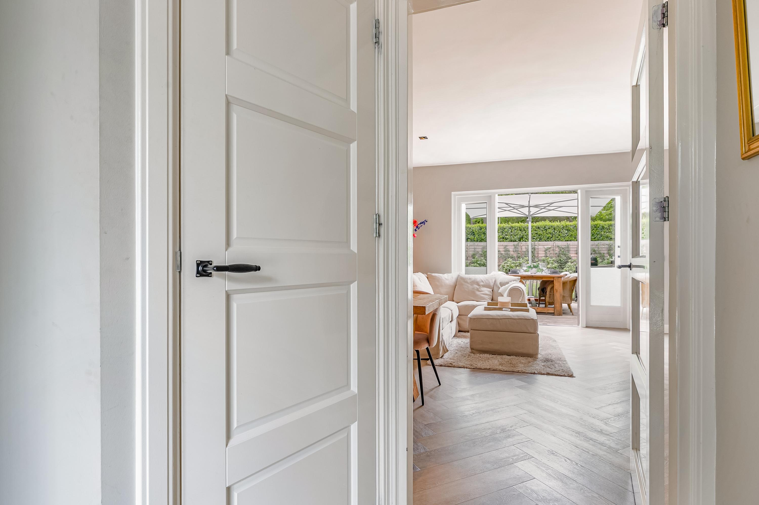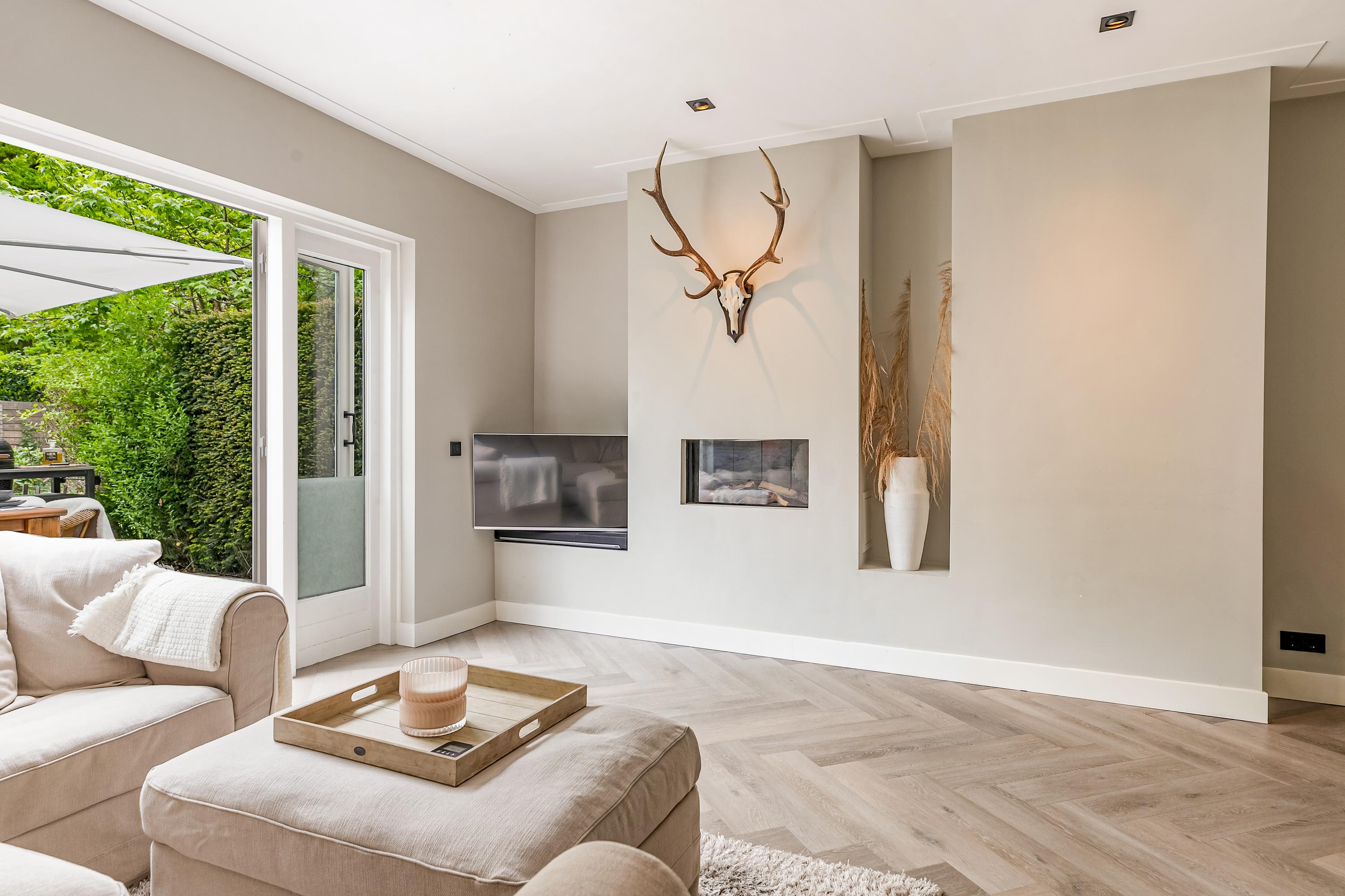 Begane grond: vanuit de entree voorzien van de meterkast en het toilet is de woonkamer bereikbaar. De sfeervolle woonkamer heeft een haard en beschikt over veel lichtinval vanwege de grote raampartijen. Vanuit de woonkamer is er directe verbinding naar de keuken. De moderne keuken is voorzien van diverse inbouwapparatuur en straalt dankzij het lichte kleurgebruik een frisse en ruimtelijke sfeer uit. Zowel de keuken als de woonkamer zijn afgewerkt met een stijlvolle visgraat pvc-vloer met vloerverwarming. Vanuit de openslaande deuren in de woonkamer is de tuin bereikbaar.