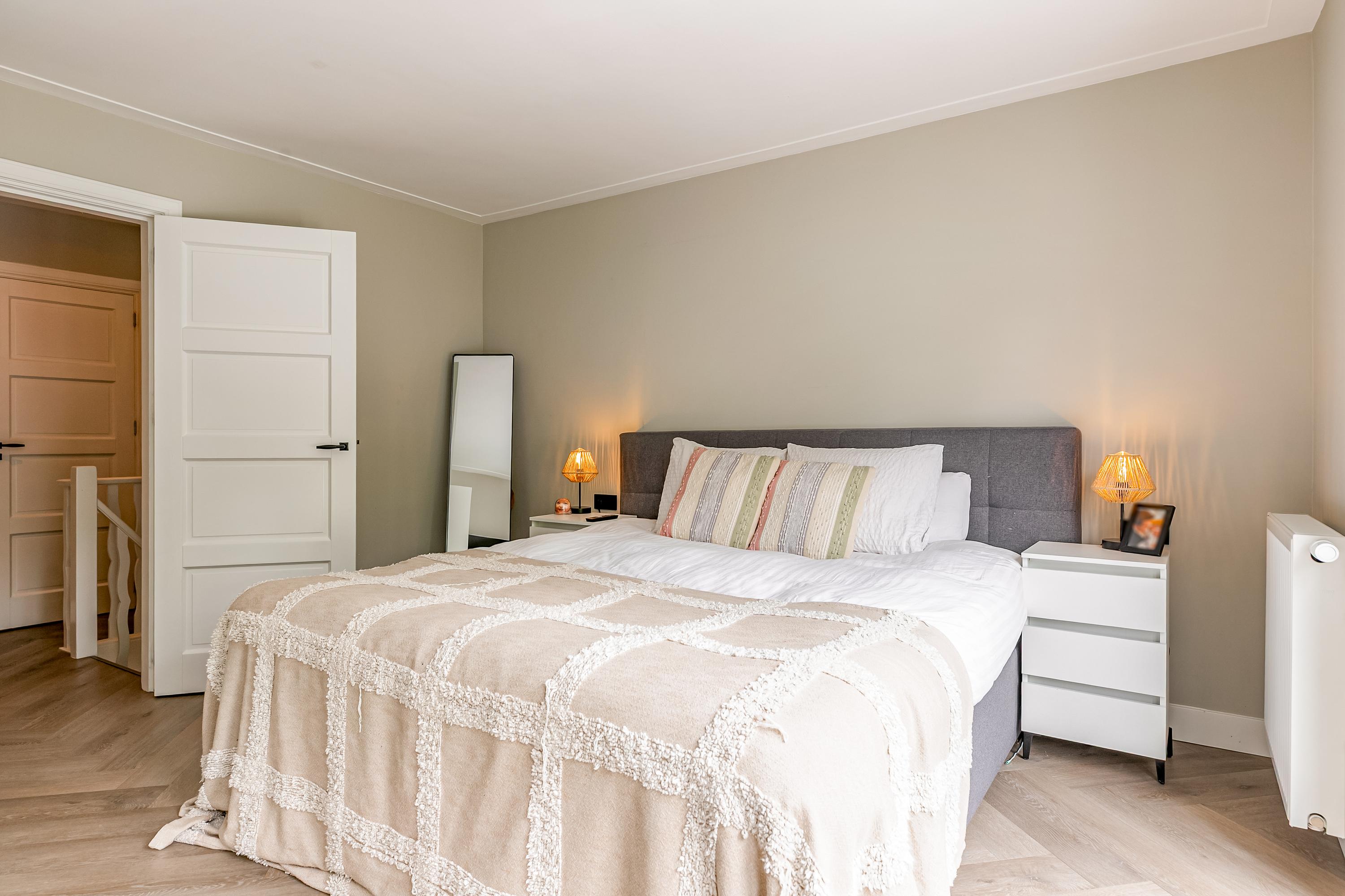 Eerste verdieping: vanuit de overloop is er toegang naar de master bedroom, het toilet, de wasruimte en de badkamer. De master bedroom is ruim opgezet, voorzien van airconditioning en aan de tuinzijde gesitueerd. De charmante openslaande deuren geven toegang naar het balkon gelegen op het zuiden. Hier heb je prachtig uitzicht over de gemeenschappelijke tuin. De moderne badkamer is voorzien van een toilet, ligbad, dubbele wastafel, inloopdouche en vloerverwarming. Deze verdieping is afgewerkt met dezelfde visgraat pvc-vloer.