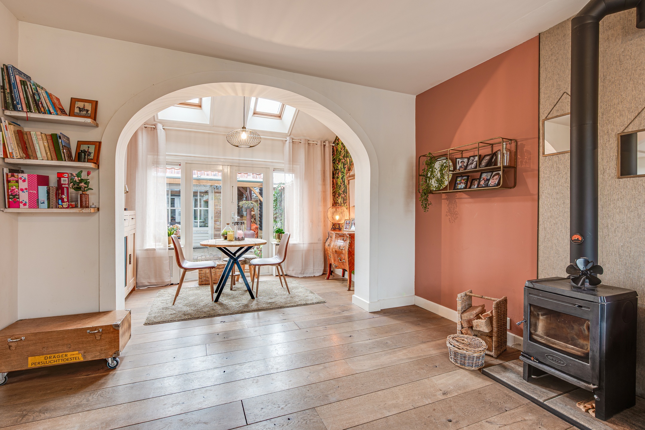 Vanuit de keuken bereik je de sfeervolle woonkamer, die aan de achterzijde is uitgebouwd. De woonkamer is ingericht met een mooie eikenhouten vloer en een houtkachel, en dankzij de grote raampartijen aan beide zijden geniet je hier van veel natuurlijk daglicht. Aan de achterzijde zorgen de openslaande deuren voor een directe verbinding met de tuin.